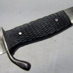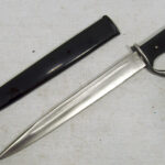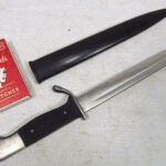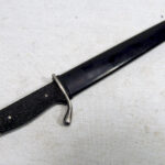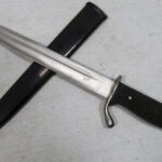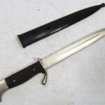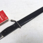 For your consideration, you are viewing a piece of Military History, this is a miniature letter-opener souvenir version of the KS98 Dress Walking Out Bayonet. This is an interesting and scarce pre-WW2 patriotic souvenir letter-opener desk piece made in the mid-30s during the build-up to WW2 and was a very popular souvenir brought by travellers during the 1936 German Olympics. These have not survived in as great numbers as the full-size bayonets. The 140mm single-edged steel blade has a thin single fuller on each side and a thin flat spine. The blade terminates in a spear point, The hilt has a flattened bird's head pommel with a rear-facing quillon, black wooden checkered grips complete with its rolled steel scabbard with a high black gloss finish, that has no frog button and an inner leather lining. # This has NO maker marks CONDITION: This mini bayonet letter opener is from the mid-30s, and it is in very good condition for its age. The grips are in excellent condition with no missing pieces, no indents or marks and fit tightly to the tang. The 14cm blade has no stains and no pitting. The edge is not sharp and has no dings. The remaining metal on the cross-guards, pommel and mortise has a polished finish with some scuff wear and an aged patina. The scabbard is in excellent condition and the knife sheathes and draws smoothly and fits tightly together with the bayonet. # Please note that the photographs form part of the description; Super-sized photos are available for viewing in the eBay gallery, to show the finer details and conditions.- Photos do not show the actual size so please make sure you read the description page to get the exact measurements.
