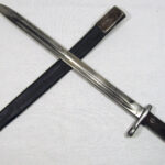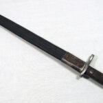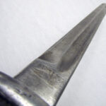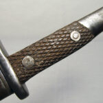 This bayonet is vintage WWI, used, and in good condition for its age and uses in warfare. The checkered wood grips are in very good condition, with light scuff and wear marks consistent with use and fit tightly to the tang, the release/lock button is in working order. The 39.3 cm blade has a polished finish with an overall scattered stain and an aged grey patina, with some very light pitting on the rounded spine at the knife end. The edge is not sharp and has no dings. The remaining metal on the cross-guards, pommel and mortise has a polished finish with some wear and grey patination. The scabbard leather is supple and the stitching is intact, it has some scuff. The metal mounts have no dents but have some marks and fit tightly together with the bayonet. # Please note that the photographs form part of the description; Super-sized photos are available for you to view in the eBay gallery, to show up the finer details and conditions.